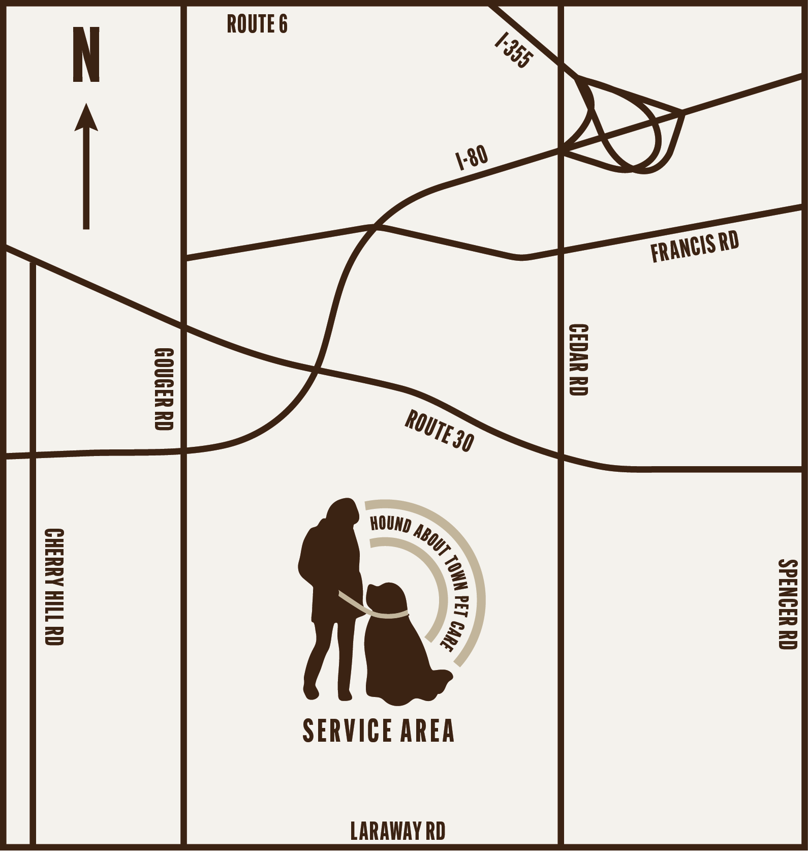 The photo below shows our standard service area. For care requests outside of this service area, there may be an added fee based on distance.